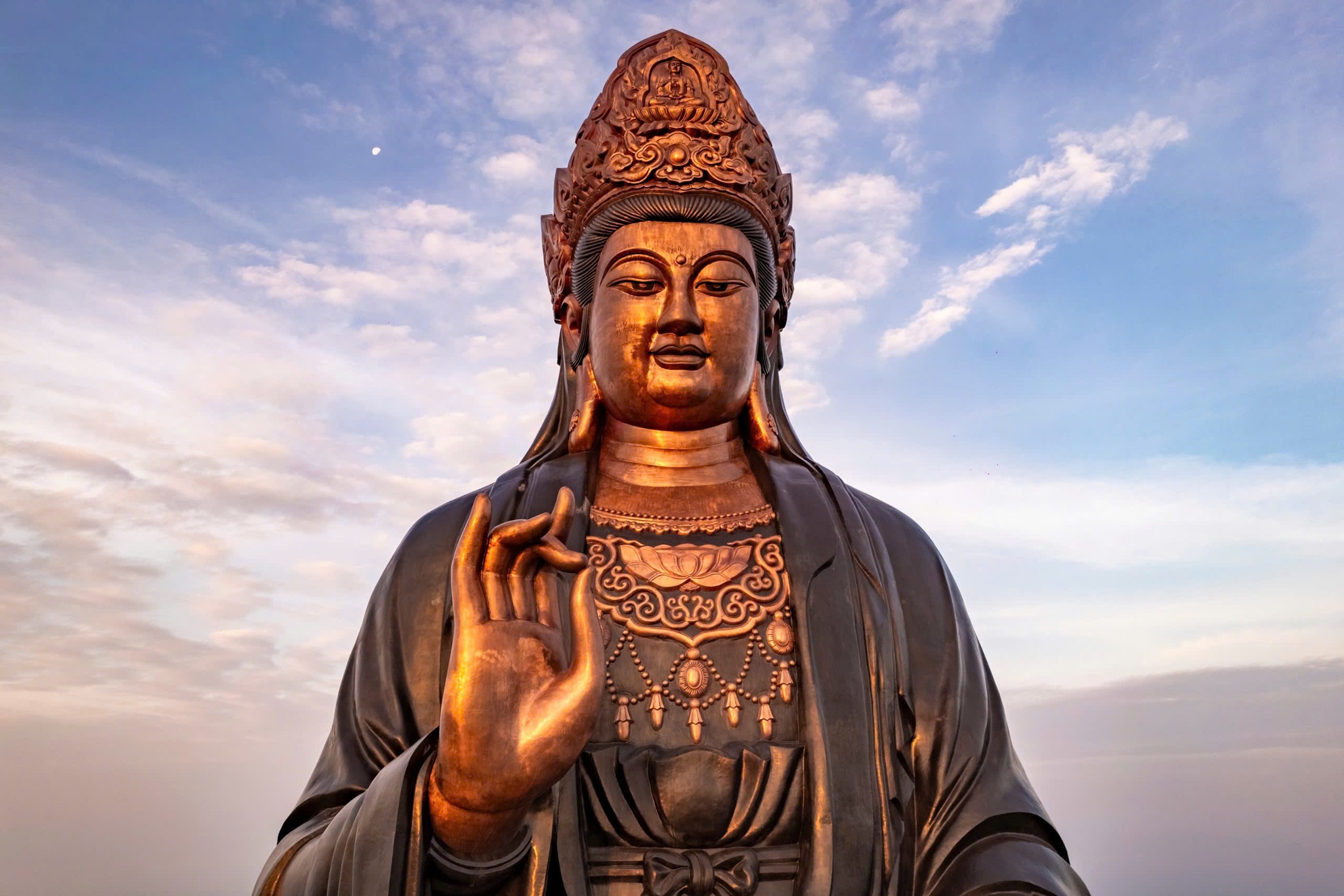Tượng được đúc từ khoảng 170 tấn đồng. Hình tượng Phật Bà đứng uy nghi trên đỉnh núi. Khuôn mặt tượng được chạm khắc tinh xảo với đường nét đầy đặn. Ánh nhìn hiền hòa tạo cảm giác an yên cho người chiêm bái. Búi tóc cao, phủ khăn dài, đầu đội vương miện chạm khắc hình Phật A Di Đà. Chi tiết này mang ý nghĩa kế thừa và soi sáng. Tay trái tượng cầm bình cam lộ đang dốc xuống. Hình ảnh biểu trưng cho sự cứu khổ và ban phát phúc lành.