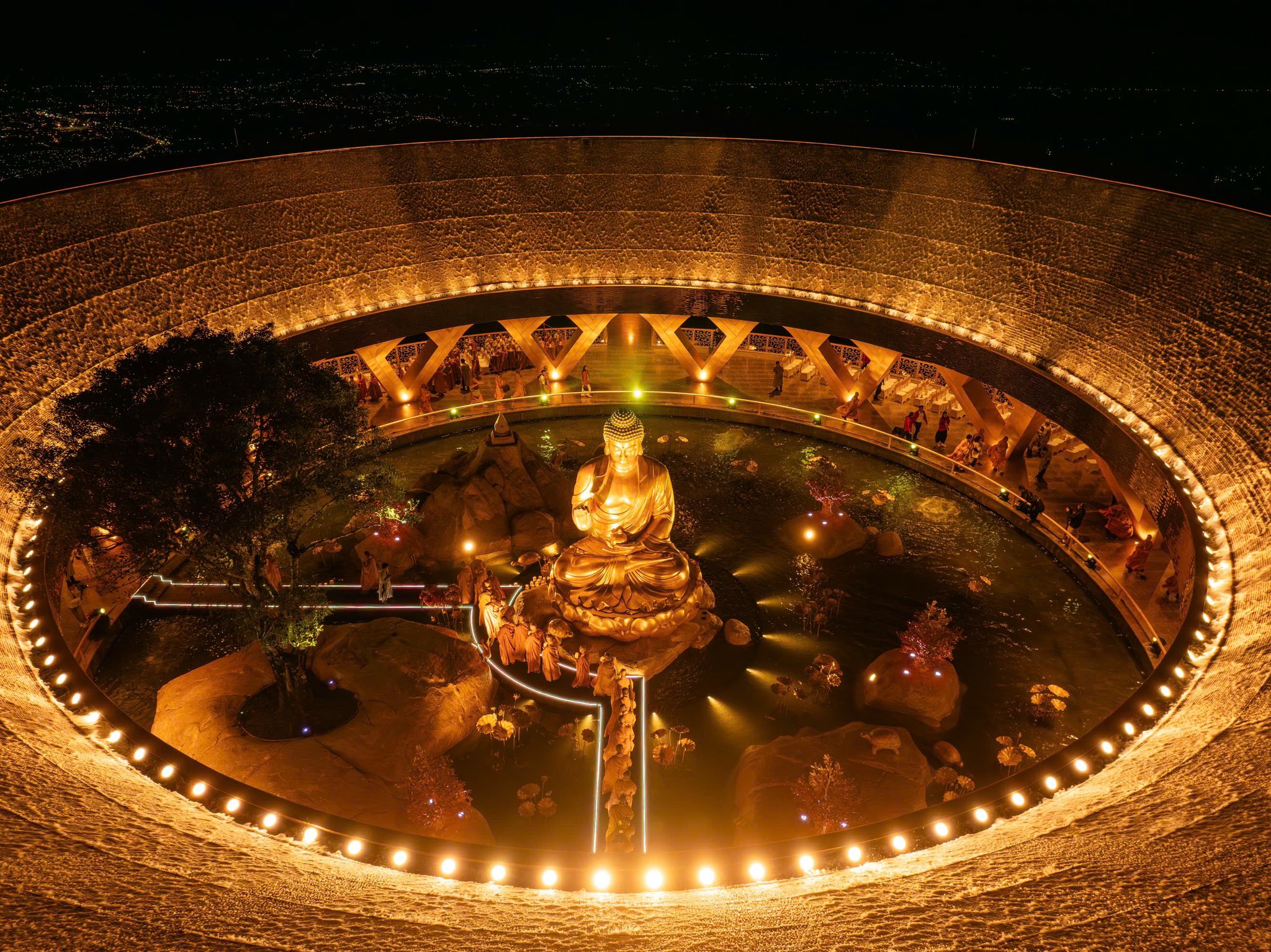 Bao quanh pho tượng là thác Ưu Đàm được tạo hình từ 32 cột vàng, tượng trưng cho 32 tướng tốt của Đức Phật. Nước từ thác đổ xuống hồ sen vàng phía dưới, mang thông điệp về sự thịnh vượng và an lành. Theo tư liệu Phật giáo, tên gọi “Kanakagamana” trong tiếng Phạn có nghĩa là “đấng đến từ vàng”, gắn với truyền thuyết mưa vàng khi Đức Phật đản sinh. Sau lễ an vị, nơi đây nhanh chóng trở thành điểm hành hương thu hút đông đảo du khách, đặc biệt vào dịp đầu năm.